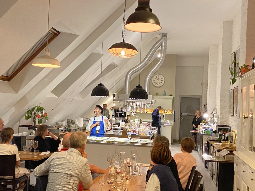 Wir öffnen das Kochstudio ab 18.30 Uhr. Du hast die Gelegenheit, in Ruhe einen Apéritif zu genießen. Bei diesem kulinarischen Event in unserem Kochstudio brauchst du nicht selbst kochen, sondern kannst dich von uns mit dem Gourmet-Menü verwöhnen lassen. Du sitzt zusammen mit anderen Gästen an einer Table d’hôte (größerer Gästetisch) und siehst dabei zu, wie Claude an der Kochinsel das Menü fertig stellt und anrichtet.