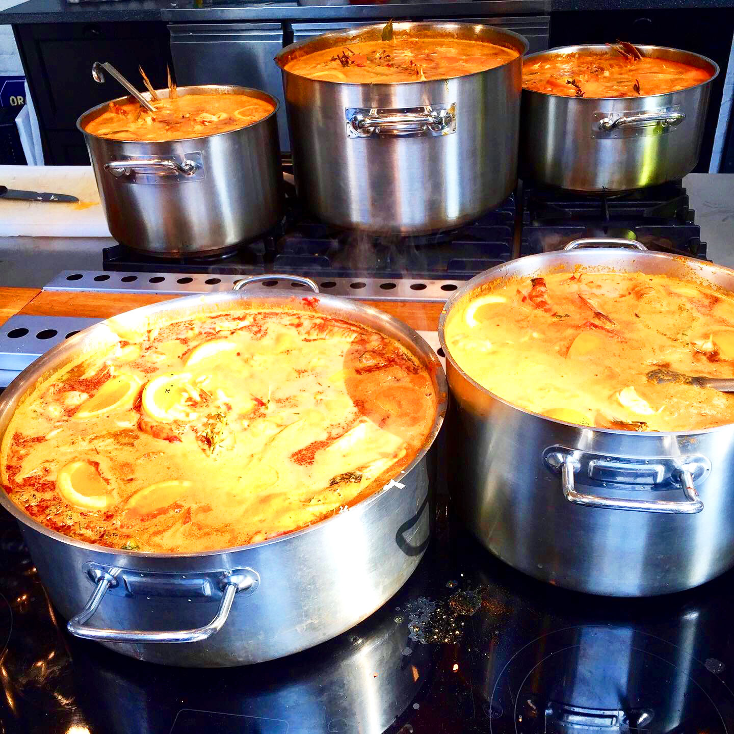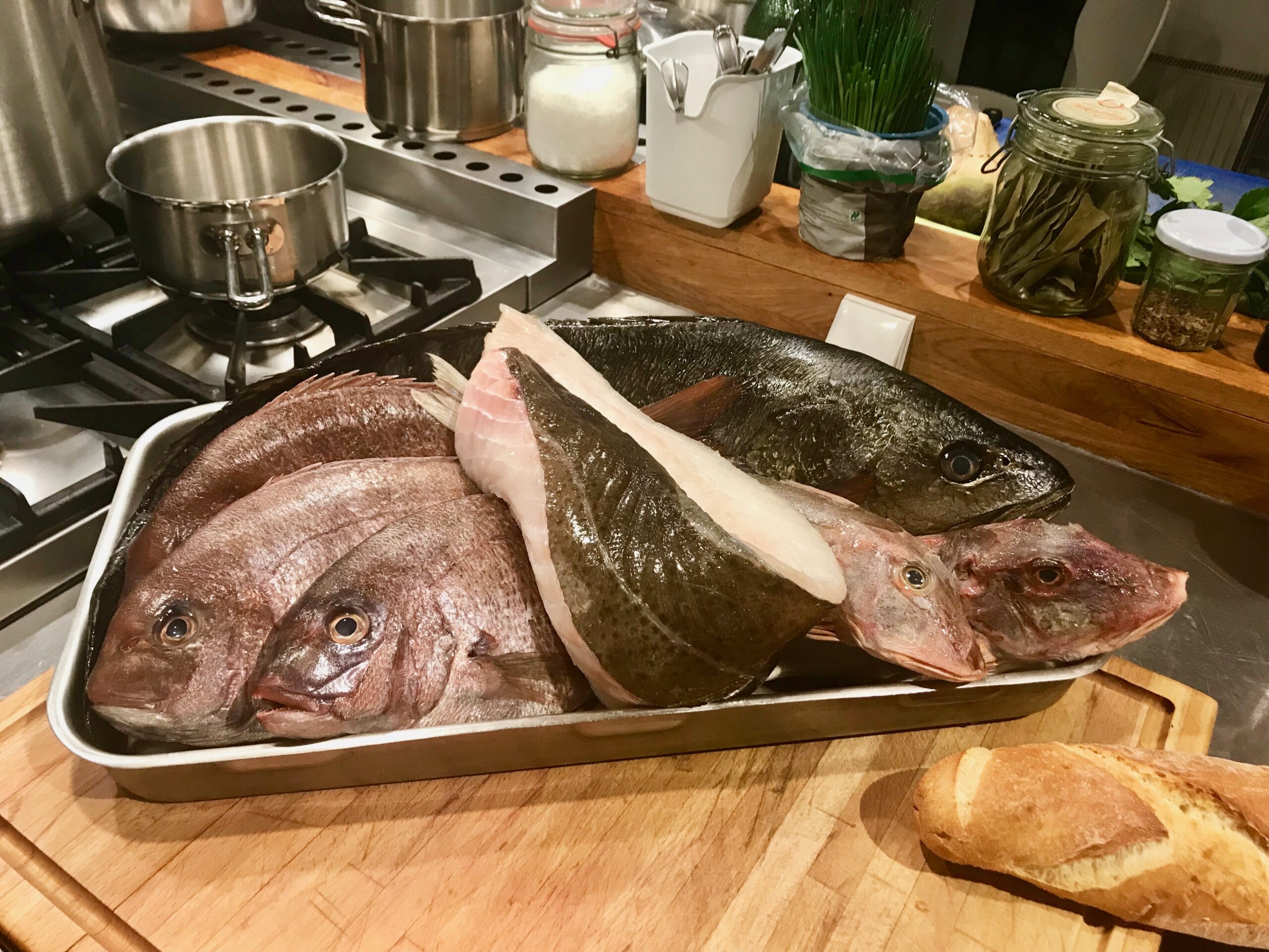 Ab ca. 19.30 Uhr beginnen wir mit dem Anrichten und Servieren der Bouillabaisse. Bitte nehmt rechtzeitig eure Plätze ein. Wir servieren die Bouillabaisse wird im Family-Style, d.h. auf Platten und in Schüsseln auf dem Tisch. Sie wird in zwei Gängen genossen. Das heißt, zuerst wird die Fischsuppe mit Croutons und Rouille gegessen und im zweiten Service kommen die Edelfisch-Stücken auf die Teller und werden nochmals mit Suppe übergossen. Zum Menü schenken wir Rosé-Wein aus. Am Ende wird noch ein kleines Dessert als süßer Abschluss serviert.